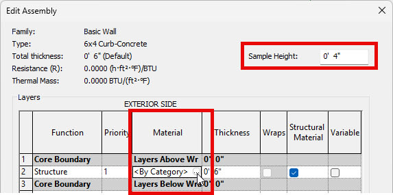 - Edit Sample Height in the upper right corner to the height of your curbing. This is only for displaying this wall in the Preview panel and does not control the height at which you would draw this specific wall in the model.