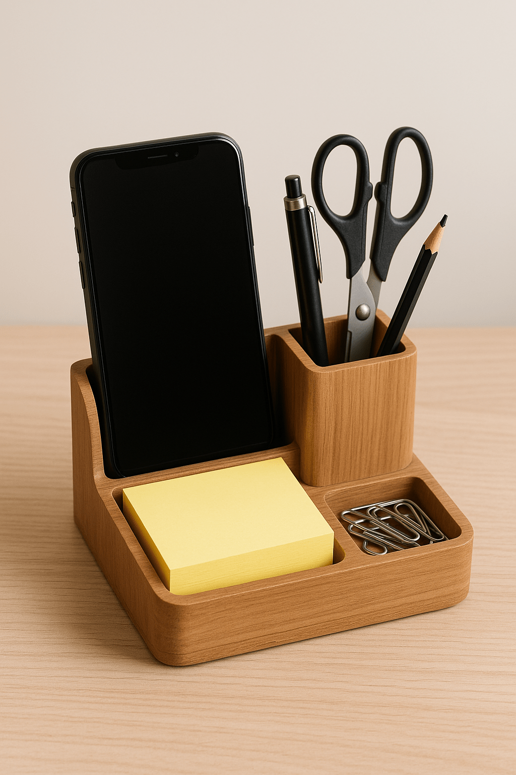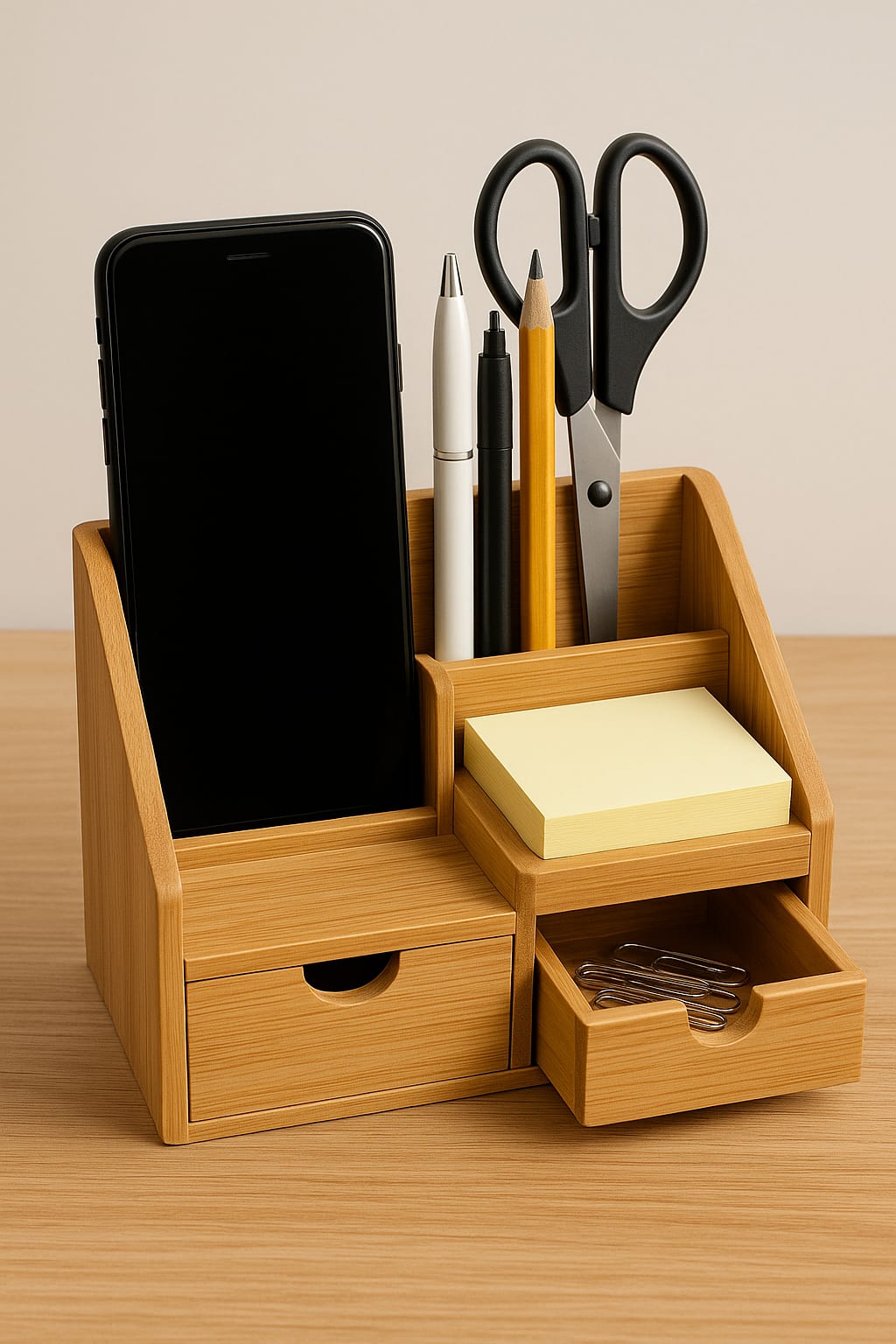“Design an image of a desk organizer that can hold a cell phone and office stationery.”