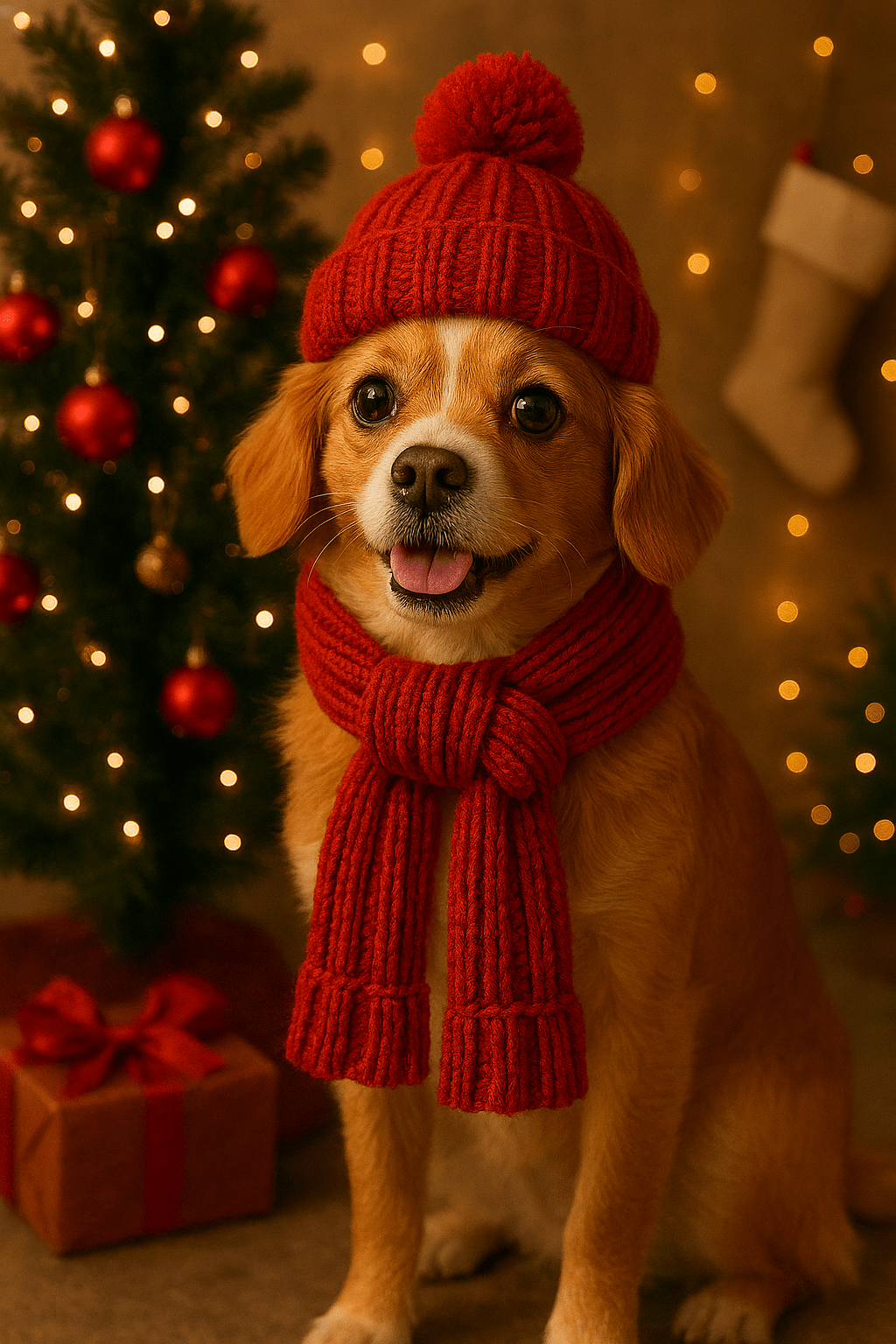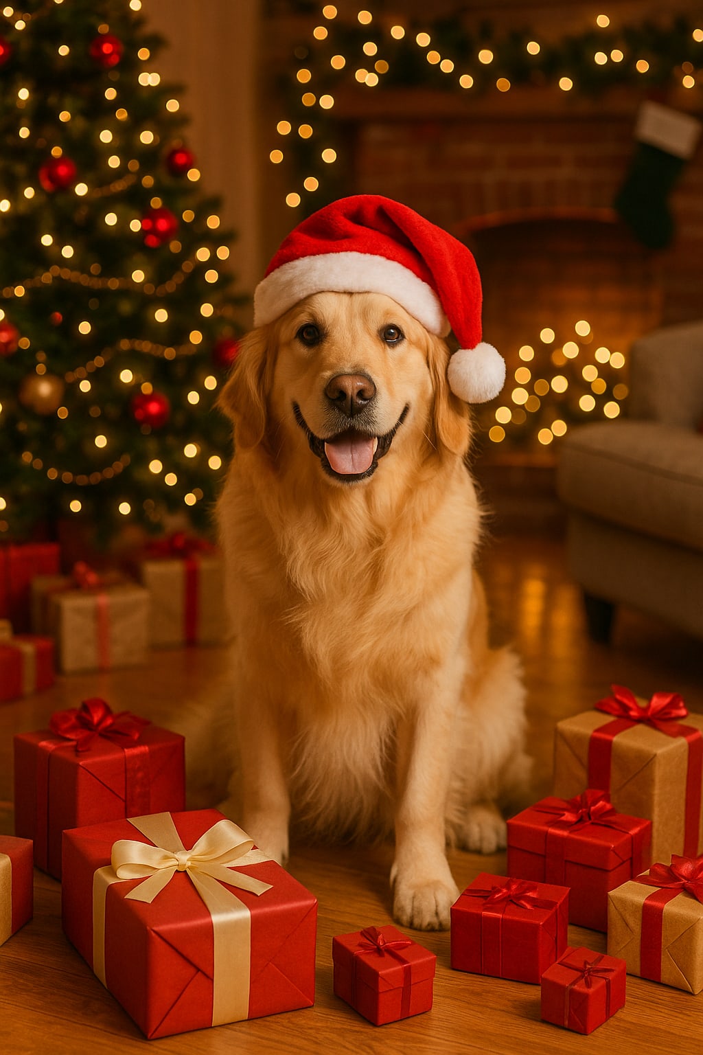 Refined Prompt: “Create a high-quality, festive Christmas marketing image featuring a friendly golden retriever sitting in a cozy, decorated living room. The dog is wearing a bright red Santa hat and is surrounded by wrapped presents and twinkling holiday lights, conveying warmth and holiday cheer. The overall scene should be inviting and joyful, designed to appeal to pet lovers and enhance brand appeal during holiday campaign.”
